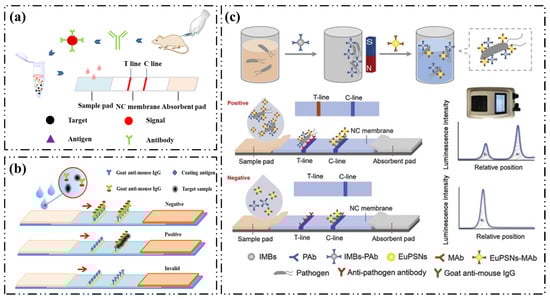 Based on the difference in molecular weight of the target, an LFIA can be divided into competitive immunochromatography or double-antibody sandwich immunochromatography methods (Figure 3b,c) [7,10].