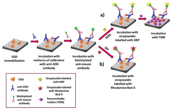 The determination of SOD was based on a competitive immunoassay format, where the signal is inversely proportional to the analyte concentration in the sample, and the detection sensitivity is defined by the percent signal drop of the calibrators containing known amounts of analyte to the signal obtained for the zero calibrator. Two different assay configurations were investigated in order to select the one providing the highest assay sensitivity. The first configuration involved after the primary immunoreaction, i.e., the reaction of the calibrator or sample with the anti-SOD antibody, reaction with an appropriately labelled secondary antibody for the acquisition of SEF or SERS signal, and it would thereby later be referred to as a 2-step assay. The second one, after the primary immunoreaction, involved incubation with a biotinylated secondary antibody followed by a reaction with appropriately labelled streptavidin, and it would later be referred to as a 3-step assay. For both configurations, critical parameters were optimized in terms of SEF and SERS signal intensity and assay sensitivity, such as the concentration of SOD for coating of the substrates, the anti-SOD antibody concentration, and the duration of each assay step.