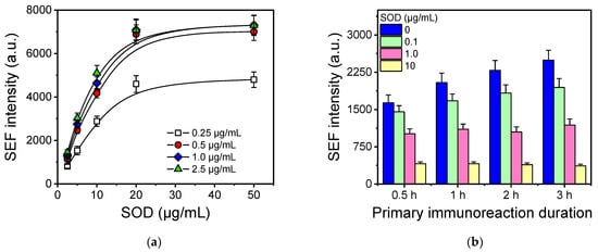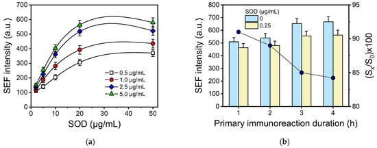 Using the selected SOD and anti-SOD antibody concentrations, the effect of primary immunoreaction duration on the zero calibrator signal and assay sensitivity was investigated. As indicated in Figure 2b, the SEF signal intensity increase was notable when the incubation time was prolonged to 3 h (28% increase with respect to 2 h), whereas further extension of the primary immunoreaction duration did not provide a further increase of SEF intensity values. Moreover, the assay sensitivity, as indicated from the percent signal values corresponding to the calibrator containing 0.25 μg/mL SOD with respect to the zero calibrator, was slightly improved when the primary immunoreaction duration increased from 2 to 3 h. Thus, a 3 h primary immunoreaction duration was adopted in the final protocol. It should be noted that the secondary antibody was used in all cases in excess (10 μg/mL) and the secondary immunoreaction duration was 1 h.