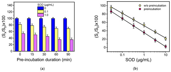 The effect of pre-incubation in detection sensitivity was also investigated. For this purpose, the SOD calibrators were mixed at a 1:1 volume ratio with the anti-SOD monoclonal antibody solution and were either applied directly onto the SOD-coated substrates or incubated at RT for different time intervals prior to their reaction with SOD on the substrates. As indicated in Figure 5a, the 15 and 30 min pre-incubation times had no significant effect on the detection sensitivity. However, after a 60 min pre-incubation, the percentage of signal drop for the calibrators containing 0.1 μg/mL and 1 μg/mL SOD, with respect to the zero calibrator, decreased from 82% to 69% and from 54% to 36%, respectively. An extension of pre-incubation time to 90 min did not further improve the detection sensitivity. Thus, a 60 min pre-incubation step was applied to the final protocol and the characteristic calibration curves obtained without and with a 60 min pre-incubation are presented in Figure 5b. Moreover, the comparison of the SOD calibration curves, presented in Figure 3 and Figure 5b, reveal an improvement in the assay sensitivity (lowest detectable concentration) by a factor of 10 when the 3-step assay configuration was applied instead of the 2-step one. This result is mainly due to the implementation of lower SOD concentrations for the coating of the substrates, and the anti-SOD antibody concentration in the primary immunoreaction, which are the two factors determining a competitive assay sensitivity.