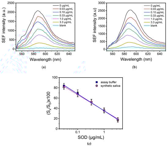 The effect of synthetic saliva on the assay sensitivity and absolute signal was investigated. In Figure 6, characteristic SEF spectra corresponding to SOD calibrators prepared in assay buffer and synthetic saliva, respectively, are presented. As shown, the presence of synthetic saliva caused an increase in absolute SEF intensity values of about 25%. However, the respective calibration curves were superimposed, as illustrated in Figure 6c and in the respective non-linear calibration curves presented in Figure S6, demonstrating negligible effect of the calibrators matrix on assay sensitivity.