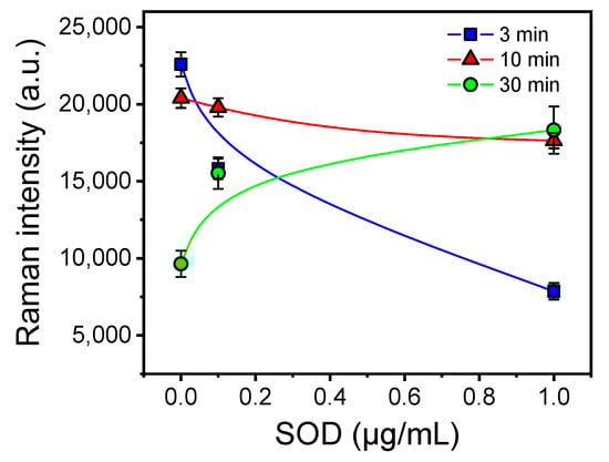 Raman intensity values corresponding to the peak at 1605 cm−1 obtained for the zero calibrator and calibrators containing 0.1 and 1.0 μg/mL SOD upon incubation with the TMB precipitating HRP substrate for 3 (blue squares), 10 (red triangles) or 30 (green circles) min. Each point corresponds to the mean value of 5 measurements from 3 different samples ± SD.