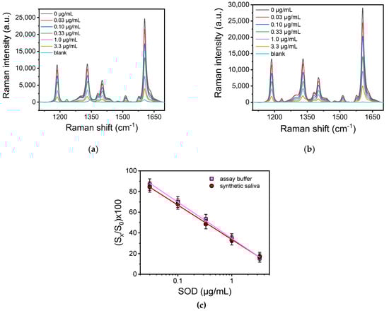 In Figure 8, the SERS spectra received for SOD calibrators prepared either in assay buffer (Figure 8a) or synthetic saliva (Figure 8b) are depicted. The respective non-linear calibration curves are provided in Figure S7. As shown, the intensity corresponding to Raman spectrum peaks of TMB at 1190, 1330, 1400, 1513 and 1605 cm−1 were inversely proportional to the SOD concentration, however, the intensity of the peak at 1605 cm−1 displayed a bigger percentage change in comparison to the changes noted for the other peaks as the SOD concentration increased and was, therefore, selected as the SERS signal used to fabricate the respective calibration curves. It is worth noting that the presence of synthetic saliva caused an increase in the Raman intensity of all peaks by 15–20%, i.e., the effect was similar to that observed for SEF measurements. As shown in Figure 8c, the calibration curves obtained with calibrators prepared in assay buffer and synthetic saliva were almost identical. The zero calibrator absolute net value ± the standard deviation (SD) of 10 measurements were 24,655 ± 518 a.u. in assay buffer and 29,099 ± 771 a.u. in synthetic saliva, respectively. The analytical characteristics of the SOD SERS assay were calculated as described in Section 3.2. The LOD and the LOQ were 0.015 μg/mL and 0.03 μg/mL, respectively, in both matrices, while the dynamic range extended up to 3.3 μg/mL. In addition, the SERS SOD assay exhibited good repeatability, with inter- and intra-CVs ranging from 7.5 to 10.5%, and from 9.7 to 12.6%, respectively. In other words, the analytical characteristics of the SERS SOD assay were similar to those of the SEF assay. Moreover, the calibration curves obtained using the nanostructured Ag/SiNWs substrates, for either SEF or SERS measurements, were identical to the one obtained by an enzyme immunoassay developed in microtiter plates using the same reagents (Figure S8).