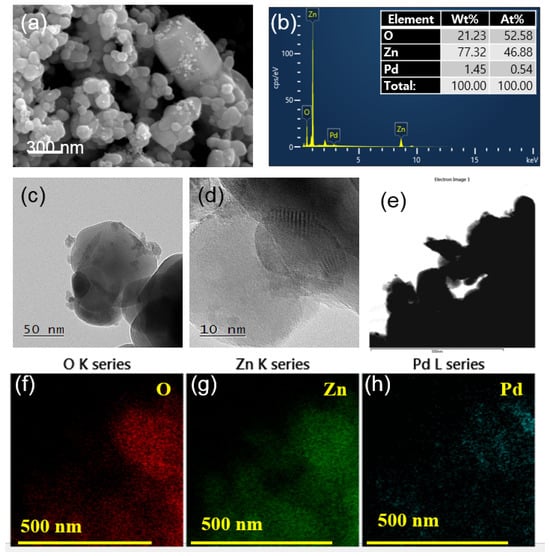 (a) SEM image of Pd-decorated ZnO NPs and (b) corresponding EDS analysis. (c) TEM and (d) HRTEM images of Pd-decorated ZnO NPs. (e–h) TEM-EDS color mapping analysis of Pd-decorated ZnO NPs.
