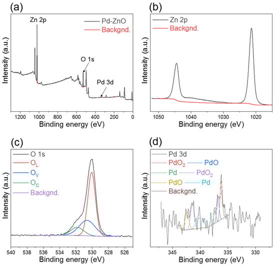 (a) XPS survey of Pd-decorated ZnO NPs and corresponding deconvoluted core-level XPS region of (b) Zn 2p, (c) O 1s, and (d) Pd 3d.