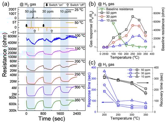 Figure 4a displays the dynamic resistance curves of Pd-decorated ZnO NPs to 10, 30, and 50 ppm H2 gas at different temperatures (25–350 °C). At low temperatures (25 and 50 °C), the resistance is extremely high (in the range of tera-ohm), and no variation was recorded upon the injection of H2 gas. By increasing the sensing temperature, the baseline resistance decreased gradually due to the jumping of electrons from the valence band to the conduction band of the ZnO. When the sensing temperature was 150 to 350 °C, the sensor was able to detect H2 gas. All the resistance decreased upon exposure to H2 gas, revealing the n-type nature of the ZnO gas sensor, as expected. Also, the resistance comes back to its initial value after the stoppage of H2 gas, revealing the reversibility of the sensor. To gain a better insight, we calculated the response values versus sensing temperature for different concentrations of H2 gas (Figure 4b). For all gas concentrations, the response value gradually increases up to 250 °C, and then it decreases. In fact, at low temperatures, there is not sufficient energy for H2 gas to surpass the adsorption barrier, while at high temperatures, the desorption rate is higher than the adsorption rate. At the optimal sensing temperature, the adsorption and desorption rates are equal, and maximum response is observed. Since at 250 °C, the sensor showed an enhanced response to H2 gas, further studies were performed at 250 °C. To check the sensor properties in detail, we also investigated the baseline resistance at different temperatures (Figure 4b). The resistance values at 100, 150, 200, 250, 300, and 350 °C were ~560, 234, 42, 35.7, 4.3, and 0.77 MΩ, respectively. Thus, as expected, the resistance values decreased, which reflects the semiconducting nature of the sensing material. In addition, we calculated the response time and recovery time versus a high sensing temperature for different concentrations of H2 gas (Figure 4c). Also, in Table S1, we have summarized the details of response time and recovery time.