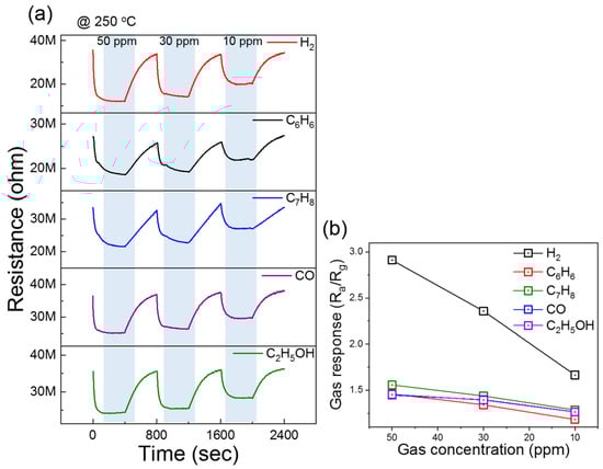 Gas sensing measurement was performed as follows. The target gas concentration was 100 parts per million (ppm) in cylinders with dry air without relative humidity (0% RH) conditions. We used dry air as a balancing gas to produce target gases (H2, C7H8, C6H6, CO, and C2H5OH) at the desired concentration. Using mass flow controllers (MFCs), dry air-balanced target gas from standard cylinders and pure dry air were combined in a desired ratio and injected into the gas chamber to achieve the target gas concentration. A constant flow rate of 500 cm was kept throughout the sensing measurements. For the sensing tests, using a Keithley 2400 source meter, the sensor’s resistance in the air (Ra) and in the presence of the target gas (Rg) were constantly measured, and the sensor response was calculated as R = Ra/Rg. The response time and recovery times are defined as the time taken for the sensor to reach 90% of its total resistance change to the presence and stoppage of H2 gas, respectively. H2 gas-sensing behaviors were tested at various temperatures in both dry and humid air (RH 0–80%). To test the sensor behavior in the presence of RH, dry air was injected into a sealed gas beaker filled with water to prepare the air to 100% RH. This created air bubbles that flowed into the exit line. The RH values could be adjusted by combining dry air with 100% humid air.