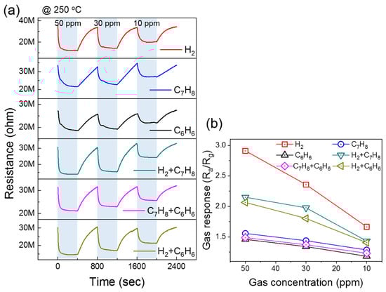 (a) Dynamic resistance curves of Pd-decorated ZnO NPs to various concentrations of H2, C7H8, and C6H6 gases and their mixtures with H2 gas at 250 °C. (b) Corresponding gas response for different gases and their mixtures.