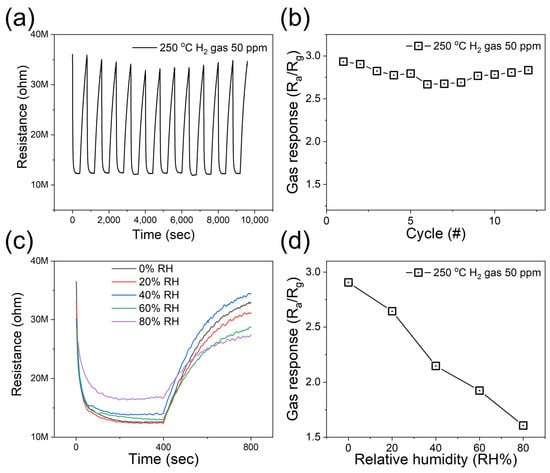 (a) Repeatability of Pd-decorated ZnO gas sensor during twelve H2 sensing cycles (50 ppm) at 250 °C. (b) Corresponding response versus gas-sensing cycle number. (c) Dynamic resistance curves of Pd-decorated ZnO gas sensor to 50 ppm H2 gas at 250 °C in presence of various levels of RH (0–80%). (d) Corresponding H2 gas response versus RH (%).