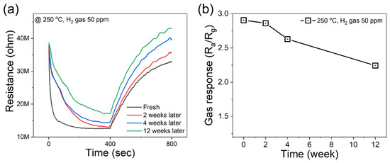 (a) Long-term stability of Pd-ZnO gas sensor dynamic resistance curves, (b) response values in fresh state and after 2, 4, and 12 weeks to 50 ppm H2 gas at 250 °C.