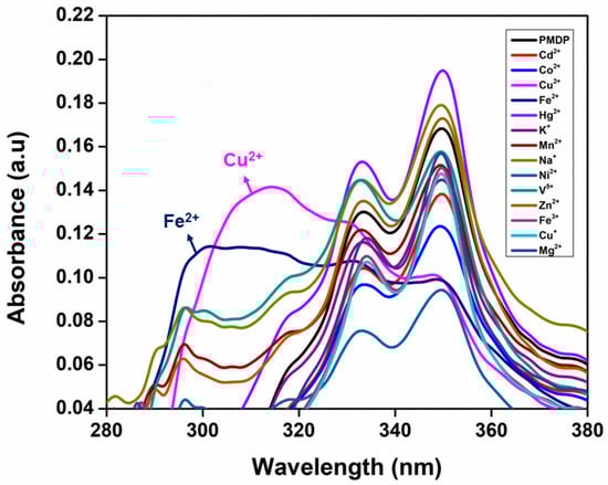 Figure 1. UV–Visible absorbance spectrum of PMDP (60 µM, HEPES 0.01 M, pH = 7.4) in DMSO solution at room temperature with different metal ions (40 µM).