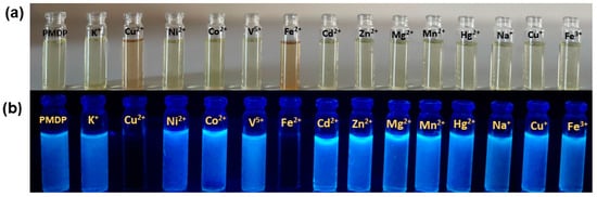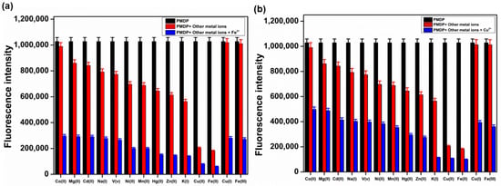 In order to evaluate PMDP’s selectivity towards different metal ions such as Cd2+, Cu2+, Fe2+, Mn2+, Co2+, Na+, Ni2+, Cu+, Fe3+, Hg2+, Zn2+, K+, V5+, and Mg2+ in a DMSO solution in the presence of 60 μM (HEPES, 0.01 M pH 7.4) at room temperature, fluorescence emission tests were carried out (Figure 3). After being excited at 350 nm, the ligand’s fluorescence spectra showed an emission band spanning from 370 to 430 nm. Fluorescence enhancement is caused by the addition of the metal ions Cd2+, Mn2+, Co2+, Na+, Ni2+, Hg2+, Zn2+, K, Mg2+, and V5+ to the ligand. Due to the formation of a complex between PMDP and the Cu2+ and Fe2+ metal ions, there was a significant effect on decreasing the emission intensity of the fluorescence spectra; the fluorescence spectra of the ligand only slightly change for the other metal ions. Because of this, the sensor shows a noticeable turn-off of fluorescence when Cu2+ and Fe2+ are present. The interaction between Cu2+ and Fe2+ ions and the probe results in a notable quenching of fluorescence intensity [19]. For the purpose of selectively detecting Cu2+ and Fe2+ ions, respectively, the chemosensor functions as an excellent selective fluorescence on–off sensor probe.