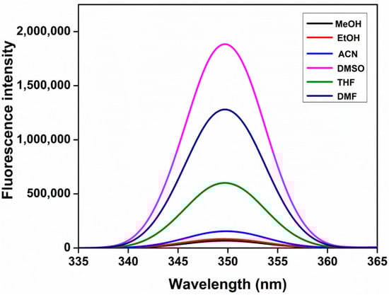 The probe PMDP’s response to the Cu2+ and Fe2+ ions was further investigated at the maximal emission intensity in a range of solvents, including DMSO, DMF, acetonitrile, methanol, ethanol, and THF. It was discovered that the type of solvent used affects the fluorescence intensity that the chemosensor can display. As shown in Figure 6, PMDP only displayed its maximal fluorescence intensity to the greatest extent in the DMSO solution.