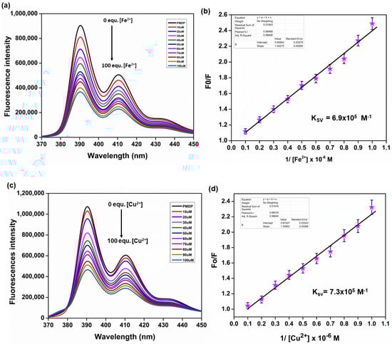 The sensitivity of the PMDP sensor to Cu2+ and Fe2+ ions was determined by fluorescence titration with solutions at concentrations ranging from 0 to 100 μM. Adding up to 100 μM of Cu2+ and Fe2+ ions to the chemosensor solution resulted in the effective quenching of fluorescence intensity, with maximum emissions at occurring at 390 nm at 350 nm excitation wavelengths (Figure 7). The chemosensor’s fluorescence intensity gradually decreased as the concentrations of Cu2+ and Fe2+ ions increased. The interaction between the Cu2+ and Fe2+ ions and the probe PMDP resulted in a notable reduction in fluorescence intensity. In a Stern–Volmer analysis, this fluorescence titration approach was utilised to evaluate the ligand-quenching process with metal ions (Cu2+ and Fe2+). When the detecting metal ions were added, the fluorescence intensity steadily decreased. The association constant was determined using the modified Stern–Volmer Equation (1) [21].