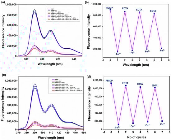 Figure 8. Fluorescence emission spectrum of reversible sensing nature of PMDP with (a) Fe2+ and (c) Cu2+ and EDTA. Reversibility cycle occurs following alternate addition of (b) Fe2+ and (d) Cu2+ and EDTA in DMSO (60 µM, 0.01 M HEPES, pH = 7.4) upon excitation at 350 nm.