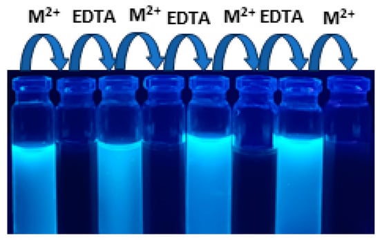 Reversibility determines whether a probe can be repeatedly detected, which is a crucial factor in practical applications. It must have an excellent reversible property in order to be a good metal sensor. Binding Cu2+ and Fe2+ ions with the probe PMDP produced fluorescence in the reversibility experiment [22]. As such, we supplemented the solutions PMDP-Cu2+ and PMDP-Fe2+ with the chelating ligand EDTA as a standard metal-complexing agent. As depicted in Figure 8, upon the addition of EDTA, the fluorescence spectra of PMDP-Cu2+ and PMDP-Fe2+ were identical to that of the PMDP without the inclusion of Cu2+ and Fe2+ ions. In addition, adding Cu2+ and Fe2+ ions to the PMDP + Cu2+ + EDTA and PMDP + Fe2+ + EDTA mixes causes the fluorescence intensity to gradually drop once more. The results of the reversible cycle suggest that the probe PMDP can be detected repeatedly; therefore it could be reused at least five times by adding an EDTA solution and a metal ion solution as replacements (Figure 9). Based on the results, PMDP’s reversible cycle performance greatly increased its potential for use in logic gate design.
