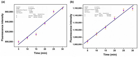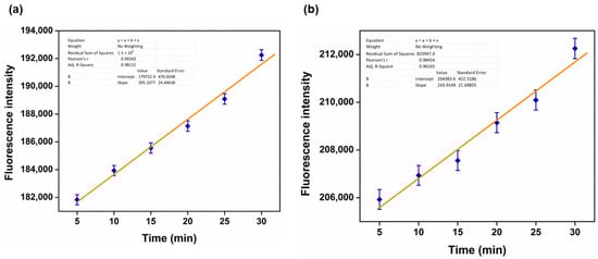 Figure 13. Linear graph of fluorescence intensity versus time of (a) Fe2+ and (b) Cu2+ at 390 nm upon excitation at 350 nm.