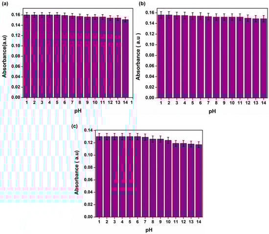 Figure 11. Absorbance of (a) PMDP, (b) PMDP + Fe2+, and (c) PMDP + Cu2+ under different pH conditions at 350 nm.