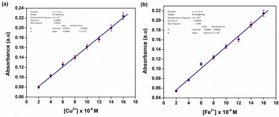 where σ represents the standard deviation of the response curve and k represents the slope of the calibration curve. The limit of detection was determined to be 0.42 μM and 0.51 μM for Cu2+ and Fe2+ by plotting the absorbance graph against the concentrations of Cu2+ and Fe2+ ions, as is shown in Figure 12.