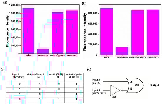 Molecular logic gates were designed for sensing applications using chemical sensors [29]. Based on the reversibility of PMDP’s detection of Cu2+ and Fe2+ ions by adding EDTA, a Boolean logic function was implemented. Use of PMDP’s output at an emission of 390 nm was made as a logic gate function. PMDP received multiple additions of Cu2+ ions and EDTA, Fe2+ ions, and EDTA (Figure 14). A strong fluorescence emission was treated as “ON” (output = 1), and a weak fluorescence emission was treated as “OFF” (output = 0). A significant reduction in fluorescence intensity was observed upon the addition of Cu2+/Fe2+ (input 1) to PMDP. With input 2, the PMDP’s fluorescence intensity was unaffected by the addition of EDTA alone. On the other hand, the addition of EDTA and Cu2+/Fe2+ caused the PMDP to become fluorescent. When the outputs A and B were both “OFF”, the fluorescence was also “OFF”. With a NOT gate available for the Cu2+ and Fe2+ inputs, the logic function could be carried out. The OR gate function was utilised to represent the input–output combination of the PMDP-Cu2+/Fe2+-EDTA, as illustrated in Figure 14d.