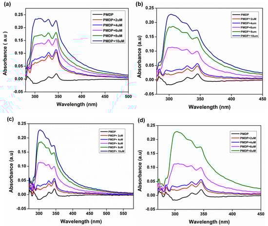 The limit of detection (LOD) of PMDP was calculated by changing the concentrations of Cu2+ and Fe2+ ions while keeping the PMDP concentration constant. The absorption spectra were produced using 50 µL of PMDP in DMSO, showing that the absorbance rises linearly with increasing Cu2+ and Fe2+ ion concentrations. For the Cu2+ and Fe2+ ions, the PMDP detection limit was computed using the following formula [27,28]: