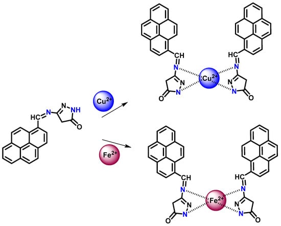 Because of the importance of these two metal ions in biology, medicine, and environmental systems, research into developing chemosensors to detect Cu2+ and Fe2+ ions has been considered particularly valuable. Traditionally, a wide range of spectroscopic techniques for identifying these metal ions are documented in the literature [12], including voltammetry, atomic absorption spectrometry (AAS), and inductively coupled plasma atomic emission spectrometry (ICPAES). Among these techniques, colorimetric “naked-eye” chemosensors and fluorescence have been used extensively for metal ion detection because of their ease of use, simplicity, low detection limit, high sensitivity, and low selectivity. Furthermore, single probes for several targets have been thoroughly investigated because of benefits like possible cost savings and faster processing times [13,14,15].