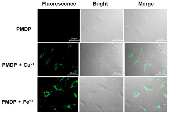 Dulbecco’s Modified Eagle Medium (DMEM) was used to cultivate HeLa cells at 37 °C in an environment containing 5% CO2. After 30 min, PMDP staining was performed, and the cells were cleaned using PBS buffer solution. With the aid of an Invitrogen EVOS M5000 fluorescent inverted microscope (Washington, WA, USA), fluorescence cell imaging was accomplished.