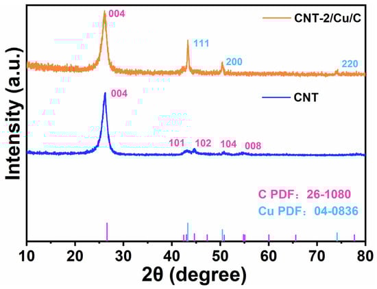 XRD powder patterns were obtained to analyze the structures of the prepared samples (see Figure 2). The XRD pattern of Cu-BTC is consistent with previously reported data [33]. The observed diffraction peaks at 26.6°, 43.0°, 44.7°, 50.8°, and 54.8° correspond to the (004), (101), (102), (104), and (008) planes of CNT [34,35], respectively, which are consistent with standard data (JCPDS 26-1080). Representative CNT-2/Cu-BTC was selected for further calcination at 800 °C in a nitrogen atmosphere, followed by XRD analysis. Upon calcination, the peaks corresponding to the (222), (400), (551), and (440) planes of Cu-BTC disappeared at 11.6°, 13.4°, 17.6°, and 20.4°, respectively. Instead, three distinct diffraction peaks appeared at angles of 26.6°, 43.3°, 50.4°, and 74.1°, representing the (004) crystal planes of hexagonal carbon (JCPDS 26-1080) and the (111), (200), and (220) crystal planes of face-centered cubic (fcc) Cu (JCPDS 04-0836) [36].