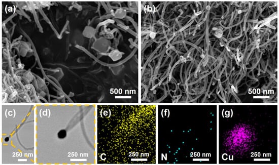 SEM and TEM spectra were obtained for each modified material, including CNT-2/Cu-BTC (a), CNT-2/Cu/C (b), and HAADT-STEM images of CNT-2/Cu/C (c,d), as well as elemental mapping images of the CNT-2/Cu/C composite (e–g).