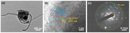 TEM images (a), HRTEM image (b), and theSAED pattern (c) of CNT-2/Cu/C composite.