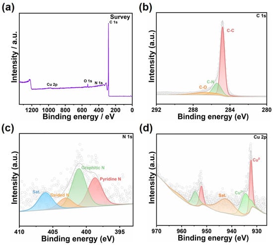 XPS measurements were utilized to investigate the chemical states and surface composition of the elements. The survey analysis of CNT-2/Cu/C reveals the presence of Cu, C, N, and O elements, consistent with the elemental mapping findings (Figure 6a). The peaks detected at 284.8 eV, 285.4 eV, and 286.6 eV correspond to the C-C bond, C-N bond, and C-O bond, respectively, in the C 1s spectrum (Figure 6b) [37]. The generation of C-O primarily stems from the oxidation of carbon materials, while MOF materials exhibit high porosity, which promotes increased exposure to air and facilitates extensive interaction with ions in solution during reactions. The N 1s spectrum (Figure 6c) shows peaks at 398.7 eV, 401.1 eV, and 403.3 eV, corresponding to pyridinic N, graphitic N, and oxidized N, respectively [38]. This indicates the successful introduction of nitrogen into the material (consistent with the mapping results mentioned above), and the incorporation of nitrogen effectively enhances the material’s electrical conductivity [39]. Figure 6d displays the Cu 2p spectrum, with peaks at 932.2 eV and 934.7 eV representing Cu 2p3/2, and peaks at 954.8 eV and 952.5 eV representing Cu 2p1/2 [40]. These results confirm the successful decoration of Cu-BTC MOFs using the CNT-based platform.