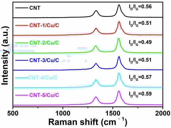 To gain a better understanding of the electron-transfer conductivity of the modified electrode, Raman scattering spectra were recorded and the results can be seen in Figure 7. It has been demonstrated that defects inherent to carbon surfaces are crucial active sites for conducting electricity. The significant flaw in graphitic carbon can lower electrical conductivity, hindering the movement of carriers and transfer of charge. Figure 7 shows the Raman spectrum of the calcination process resulting in the CNT-n/Cu/C materials. The spectrum displays two characteristic bands: the D band at 1345 cm−1 and the G band at 1589 cm−1. The D band signifies inherent defects and irregularities in carbon materials, while the G band indicates the graphitization process. The intensity ratio of the D and G bands can be used to determine the degree of defects/orders. The CNT-2/Cu/C with the lowest ID/IG ratio of 0.49 exhibited the best electrochemical property due to the presence of more graphitic carbon. It is widely accepted that a higher degree of graphitization results in greater electrical conductivity of carbon materials, making it easier to expose the active sites.