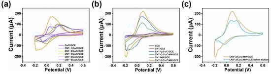 The CV plots for each electrode modification were obtained in a solution containing 5 mM [Fe(CN)6]3−/4− and 0.1 M KCl. (a) The plots included a GCE modified with Cu/C, CNT-1/Cu/C, CNT-2/Cu/C, CNT-3/Cu/C, CNT-4/Cu/C, and CNT-5/Cu/C; (b) a bare glassy carbon electrode (GCE), a GCE modified with CNT, CNT-2/Cu/C, CNT-2/Cu/C/NIP, CNT/MIP, and CNT-2/Cu/C/MIP; (c) a GCE modified with CNT-2/Cu/C/MIP and CNT-2/Cu/C/MIP before elution.