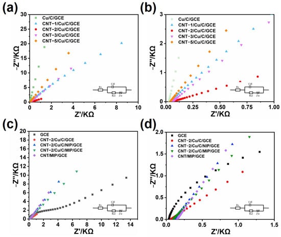 Electrochemical impedance spectroscopy (EIS) was performed on each modified electrode to analyze its electron transfer properties. The internal resistances associated with the electron transfer mechanism were evaluated using the arc radius of the EIS Nyquist plot. A smaller radius of curvature generally indicates a greater ability for electron transfer. Figure 9a shows a significant decrease in the resistance of CNT-2/Cu/C/GCE compared to the other electrodes. This is due to the composite’s excellent electrical conductivity. From Figure 9b, it can be seen that the introduction of MIP increases the electrode’s resistance due to the poor conductivity of MIP; however, its resistance is still lower compared to other electrodes with MIP.