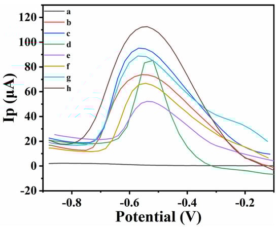 The DPV electrochemical behavior curve of each modified electrode was measured in a 0.1 M PBS solution at pH 7 with a constant concentration of 4,4′-ODA at 10 μM. The electrodes tested included a bare GCE (a), CNT-1/Cu/C/GCE (b), CNT-2/Cu/C/GCE (c), CNT-3/Cu/C/GCE (d), CNT-5/Cu/C/GCE (e), CNT/MIP/GCE (f), CNT-2/Cu/C/NIP/GCE (g), and CNT-2/Cu/C/MIP/GCE (h).