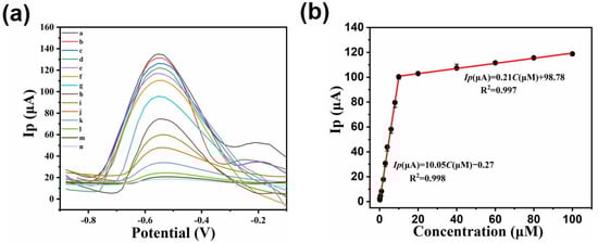 (a) DPV curves of CNT-2/Cu/C/MIP/GCE in a 0.1 M PBS buffer with pH of 7 with varying concentrations of 4,4′-ODA under ideal experimental settings. (b) Linear relationship between 4,4′-ODA at different concentrations and IP. The concentrations (a–n) range from 0.15 to 100 μM.