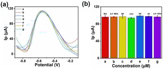 (a) The DPV signal of CNT-2/Cu/C/MIP/GCE in response to 10 μM 4,4′-ODA (with background subtracted) and (b) the bar graph showing peak current and potential interferents in the buffer solution at 10 times their concentration under ideal experimental conditions. The potential interferents include (a) methionine(Met), (b) 4,4′-methylenedianiline(4,4′-MDA), (c) biphenyl(BP), (d) urea, (e) benzidine(BZ), (f) all, and (g) 4,4′-Oxydianiline(4,4′-ODA).
