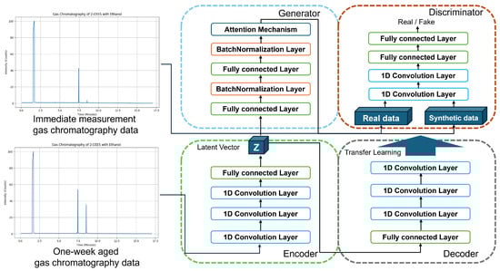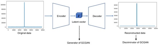 Various studies have been conducted to pretrain the generators of generative adversarial neural networks using autoencoders []. However, while only the latent vector of autoencoders is generally used for pretraining of GAN, we propose a unified learning scheme that uses autoencoders efficiently. Therefore, we unified two values of the autoencoder in GAN, as shown in Figure 2, to properly train gas chromatography. First, we use latent vectors with compressed data from encoders instead of using random variables for the generator in GCGAN. At this point, the generator of GCGAN begins meaningful mapping more proactively, and enables smooth learning when the sensitive information of the input gas chromatography learns compressed data to generate data. The latent vector of the autoencoder can help reduce the computational cost of the GAN training process, as it allows us to learn compressed representations of the data []. Furthermore, the use of latent vectors of the autoencoder can help overcome the mode decay problem in GAN training and ensure that the generator captures and generates important features of the input data [].