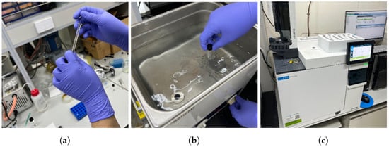 Experimental acquisition process of gas chromatography (GC) data. (a) Process of combining chemicals and solvents. (b) Process of mixing chemicals and solvents. (c) Analyze with GC equipment.