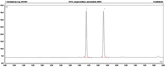 For quantitative analysis, the Thermo Scientific Trace 1300 gas chromatograph coupled with a flame ionization detector was used. The column was a 30 m × 0.53 mm × 3.00 µm Rtx-BAC1 purchased by Restek (Bad Homburg, Germany). The GC run was set as follows: the starting temperature was 60 °C for 0.3 min; then, it was increased first to 90° C at a rate of 20 °C/min for 4 min; and lastly, it was increased to 120 °C at a rate of 20 °C/min for 4 min. An injection split ratio of 25:1 was used for this type of analysis. The GC inlet was maintained at 180 °C with a constant flow of helium carrier gas at 2 mL/min. The GC detector was maintained at 200 °C. The FID air and hydrogen flows were set at 350 mL/min and 35 mL/min, respectively.