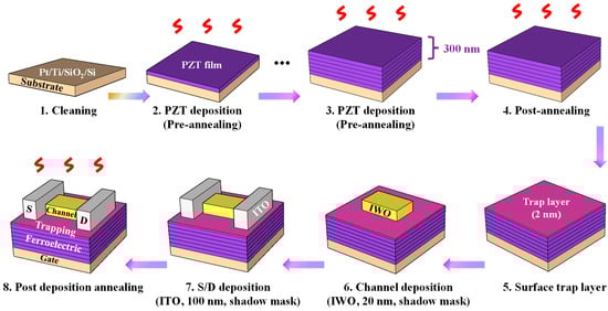 The fabrication process flow of the device, as illustrated in Figure 1, is as follows. A PZT thin film was fabricated on a Pt/Ti/SiO2/Si substrate using the sol-gel method. The PZT thin film was deposited via spin-coating at a rotation speed of 3000 rpm for 30 s. Subsequently, to promote evaporation and combustion of volatile substances and minimize film cracking, it was dried on a hot plate at 150 °C for 1 min, followed by annealing at 450 °C for 7 min and then at 650 °C for 3 min. To achieve the desired thickness, the annealing processes were repeated six times, yielding a 300 nm thick PZT film. Further, for film crystallization and intentional trap layer formation, furnace annealing of the PZT film was conducted at 650 °C for 30 min. Thereafter, an IWO channel layer with dimensions of 60 µm width × 120 µm length was deposited to a thickness of 20 nm using RF sputtering. Given the high conductivity of IWO, it is essential to engineer the off-current characteristics. Therefore, optimization was achieved through a comprehensive parameter evaluation extracted from the transfer curves of PZT-IWO FeFETs with IWO channel thicknesses of 20, 35, and 50 nm. Subsequently, ITO was deposited to a thickness of 100 nm and consequently patterned using a lift-off process to form source and drain electrodes measuring 120 µm × 150 µm. To enhance the electrical properties of the IWO semiconductor, the deposited film was annealed in a 300 °C oxygen environment for 30 min. Considering the predominant conductivity of indium in the IWO material, an engineered optimal channel thickness was determined, and the annealing conditions were optimized to enhance electrical characteristics such as the Ion/off and SS.