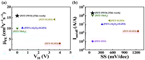 Figure 3a presents a comparison of the VH and µFE. VH was widely distributed across 0.01–4 V. This indicated that the proposed device exhibited relatively high stability at the interface between the PZT thin film and the channel as well as in terms of the operating characteristics of the channel. In terms of µFE, the excellent conductivity of IWO resulted in the devices exhibiting a mobility that was 5.86 cm2V−1s−1 higher than similar devices with comparable hysteresis window values. Figure 3b presents a comparison of the SS and on/off ratio. Notably, among devices with excellent SS values ranging between 85 and 90 (mV/dec), the fabricated device demonstrated the best performance characteristics.