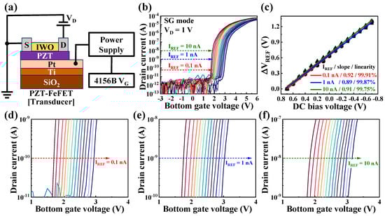 Variation in the pH value and DC bias voltage can change the potential difference applied to the gate of the transducer. This indicates the existence of a fundamental mechanism that affects the Vth of the transfer curve [44,45,46,47]. Therefore, prior to integrating the PZT-FeFET into the SG-based EG-ISFET sensor platform, measurements were conducted to assess the performance of the transducer through a DC bias test. Figure 4a illustrates a schematic of the DC bias test. An Agilent 4156B was used to apply the voltage, and the effective voltage applied to the gate was adjusted by varying the magnitude of the DC bias in the power supply. Specifically, to evaluate the comprehensive performance of the device’s operating voltage range, we applied a wide range of gate voltages from −3 V to 6 V, which exceeded the gate voltage sweeping range shown in Figure 2a. Figure 4b presents the characteristics of 15 steps of the transfer curve measured by varying the DC bias voltage from 0.7 V to −0.7 V in 0.1 V increments during the voltage sweep. Figure 4d–f present enlarged data of transfer curves at various IREF levels (0.1, 1, and 10 nA). To verify the accuracy and consistency of the IREF in three cases owing to changes in the DC bias voltage, the change in the reference voltage was measured based on the voltage at a DC bias voltage of 0.7 V. Considering the fitted data presented in Figure 4c, the slopes for IREF of 0.1, 1, and 10 nA were 0.92, 0.89, and 0.91, respectively, with good linearity of 99.91%, 99.87%, and 99.75%, respectively. Considering the potential interference from the power supply and external resistance elements between measurements, the results of the DC bias test demonstrated sufficient reliability when compared to the ideal slope value of 1. Thus, the DC bias test confirmed the capability of measuring subtle sensitivity changes owing to potential differences in the manufactured device.