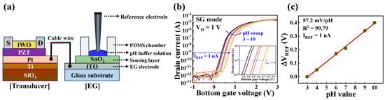 Figure 5. (a) Schematic of a PZT single-gate FeFET transducer with SnO2 EG sensing units. (b) VG–ID curves of the EG-ISFET for different pH buffer solutions. The inset in (b) highlights data pertaining to the IREF region. (c) Reference voltage shift (ΔVREF) as a function of pH value.