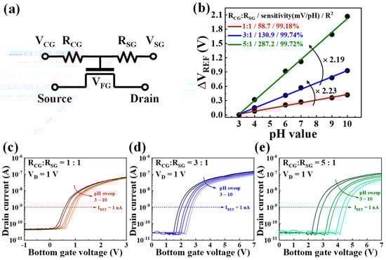 Figure 6. (a) Schematic of the equivalent circuit demonstrating the resistive coupling effect. (b) Amplification of pH sensitivity corresponding to various RCG:RSG ratios. VG–ID curves illustrating the resistive coupling effect for different pH buffer solutions: (c) 1:1, (d) 3:1, and (e) 5:1.