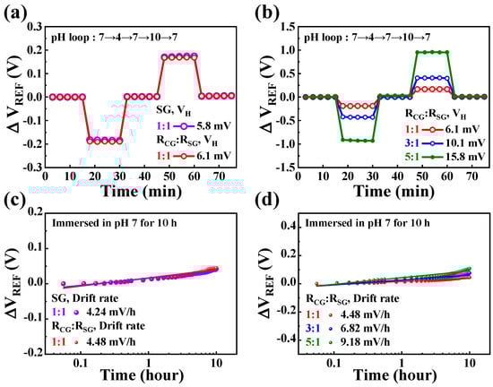 The integration of the extended-gate (EG) concept into the sensing platform highlights the necessity of verifying the stability and reliability of chemical or physical reactions on the sensing membrane. This verification was achieved through the evaluation of hysteresis and drift effects [48,49,50]. Hysteresis measurements were conducted 35 times at 2-min intervals along a designated pH loop: 7, 10, 7, 4, and 7, with the hysteresis voltage defined as the difference between the reference voltages at the first and last pH 7 buffer solution. Further, drift measurements were performed during a 10-h exposure to a pH 7 buffer solution. The measured drift rate (RD) was the variation in the reference voltage per hour caused by ions penetrating the sensing membrane over a sufficient period, based on mechanisms such as hopping or trap-limited transport [51]. Initially, the hysteresis and drift effects of the traditional SG-based EG-ISFET (SG mode) and the proposed resistive coupling EG-ISFET (RC mode) were compared directly. As shown in Figure 7a, the VH for the two types of platforms was recorded at 5.8 and 6.1 mV, respectively. The difference of 0.3 mV was considered within an acceptable range for sensor platform application. Figure 7c shows the values of drift voltage variation, with the RD in SG and RC modes exhibiting similar characteristics of 4.24 and 4.48 mV/h, respectively. Subsequently, the hysteresis and drift effects for the RC mode with RCG:RSG ratios of 1:1, 3:1, and 5:1 were compared. As depicted in Figure 7b, the hysteresis voltages were 6.1, 10.1, and 15.8 mV for 1:1, 3:1, and 5:1, respectively, indicating that the values increased according to the resistive ratio. Consequently, as shown in Figure 7d, the drift rates were 4.48, 6.82, 9.19 mV for 1:1, 3:1, and 5:1, respectively, similarly illustrating that the values varied as per the resistive ratio.
