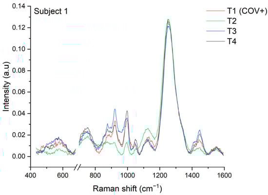Figure 2 shows the overlaid mean spectra of the four time-points of subject 1, who tested positive for one week. The SERS spectra of samples of other subjects from Group 1 are present in the Supplemental Materials (Figure S2).