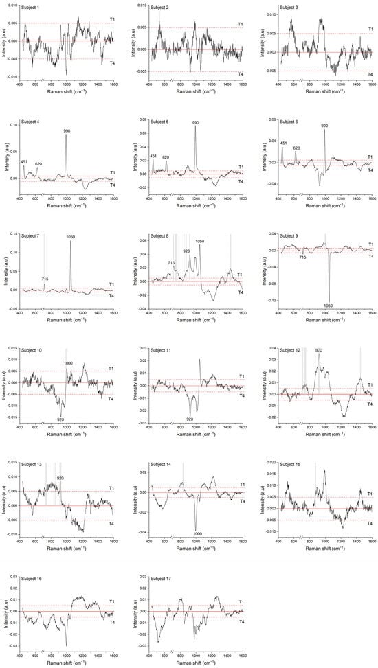 Comparing the four time-points, differences can be found mainly in the change in intensity and/or the presence and absence of specific peaks and bands. Some positive (#1T1, #8T1, #17T1, #12T1, #12T2) and negative (#1T3, #1T4, #8T2, #8T3, #17T2, #17T3, #1T4) saliva samples showed a band/shoulder at approximately 1420 cm−1 that can be related to the ring breathing modes of the DNA/RNA bases []. The peak at 852 cm−1, attributable to glycogen, proline, or tyrosine, is also present indiscriminately in subjects with a current (COV+) and past (COV−) infection []. The same applies to the peak at 715 cm−1 related to phospholipids, which may be derived from the virion particle []. To better visualise possible spectral variations characteristic of disease progression, the spectrum at T4 was subtracted from T1. We selected these two time-points because, within a month, molecular changes are expected to occur independently of whether the subject is still positive or has become negative. The resulting subtraction spectra are displayed in Figure 3. Since all the subjects were positive at T1, the spectral area above the horizontal solid line (at zero intensity) is characteristic of the initial phase of the infection when the viral load is expected to be at maximum [,].