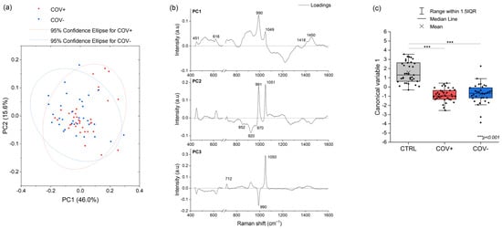 Results of the multivariate analysis. (a): PC1 and PC2 scores distribution. Each dot represents the average spectrum of each sample; (b): the loadings of the first three PCs; (c): the statistical analysis (one-way ANOVA test) on Canonical Variable 1, derived from the LDA of the CTRL, COV+, and COV− subjects.