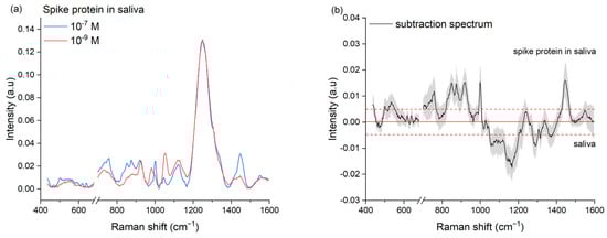 SERS analysis of spike protein added to saliva. (a) Overlapped SERS spectra of spike protein at two different concentrations; (b) subtraction spectrum of spike protein in saliva versus saliva. The grey area represents the propagation error.